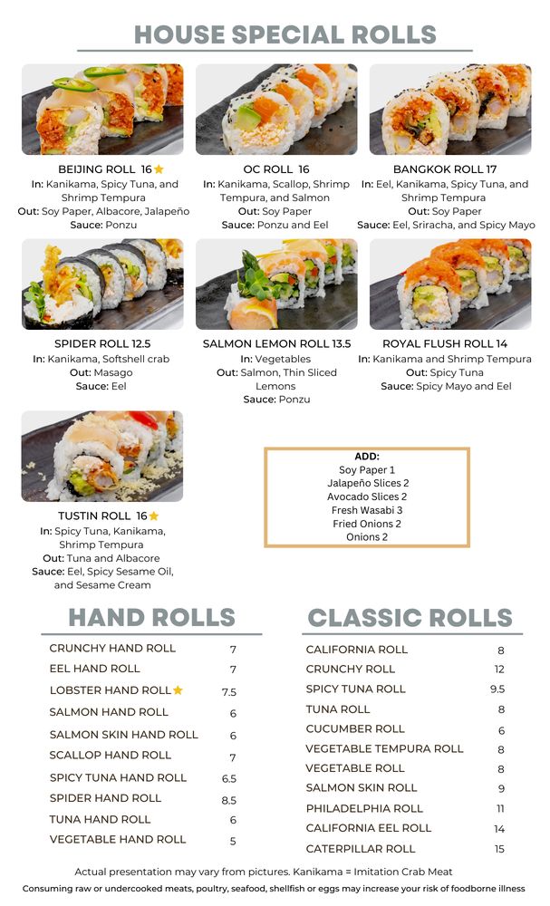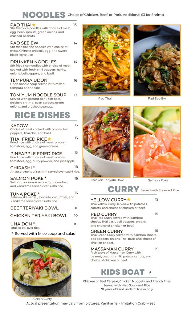 Introducing the menu at Kitajima Sushi & Thai, a delightful fusion of Japanese and Thai cuisine located in Tustin, CA. Their diverse offerings include expertly crafted sushi lunch combos, featuring enticing options like California Rolls and Sashimi, all served with miso soup and salad. The tempting appetizers, from Baked Green Mussel to Dynamite Jalapeno, showcase a burst of flavors that set the stage for an unforgettable dining experience.